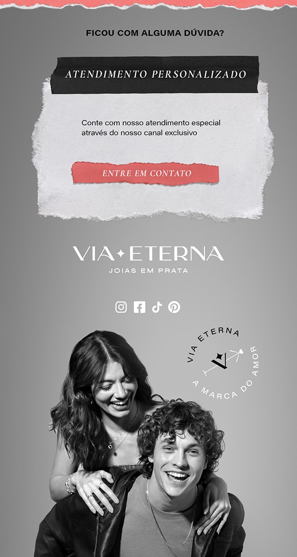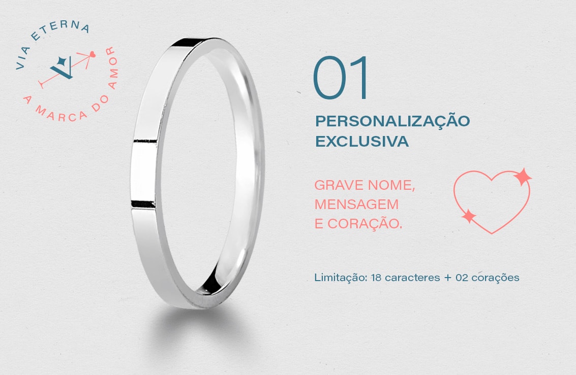 O rolê da vida de vocês começa com a aliança de namoro. Ela é o primeiro passo de uma história que vai ser escrita a dois, com a intensidade de quem se encontrou e decidiu caminhar lado a lado. A aliança de namoro Via Eterna traduz os momentos que vocês já viveram e todos os outros que ainda vão construir juntos. É a lembrança de que o amor está sempre presente, seja nas risadas, nos planos e até mesmo nos silêncios compartilhados. Na Via Eterna, vocês encontram um universo de possibilidades para escolher o modelo que mais combina com o jeito de vocês de viver o amor. Os modelos vão desde os clássicos, lisos, até os mais modernos e cheios de detalhes para transformar o compromisso de hoje em memórias que brilham para sempre.