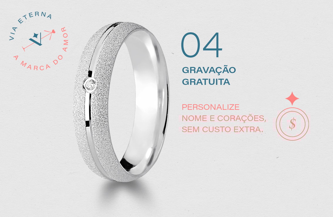 Sim! A gravação interna é gratuita com até 18 caracteres: nomes, datas ou frases curtas para compras na loja online. Esse detalhe torna sua aliança única e cheia de significado.